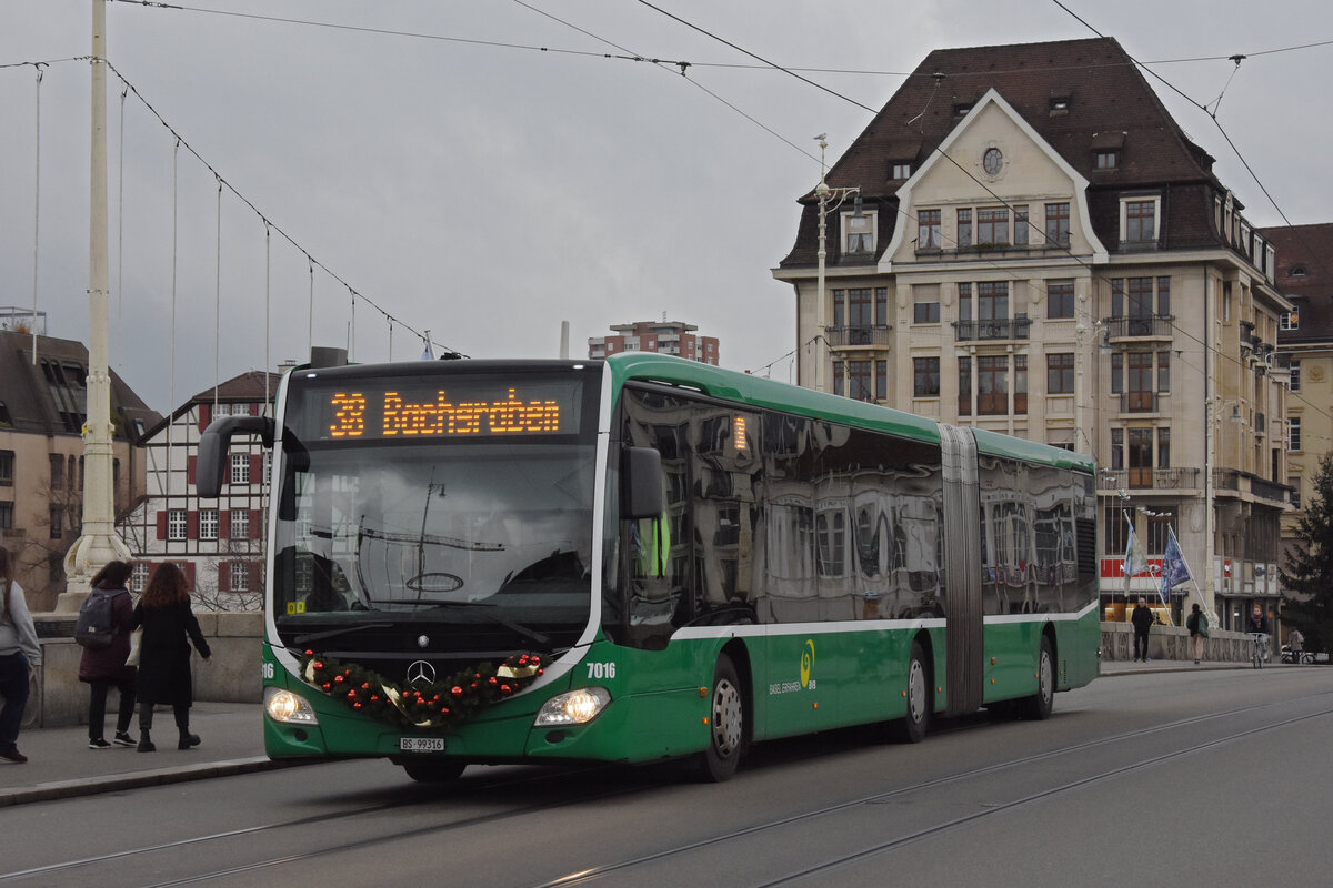 Mercedes Citaro 7016 mit einer Weihnachtsdekoration, auf der Linie 38, überquert am 30.11.2022 die Mittlere Rheinbrücke.