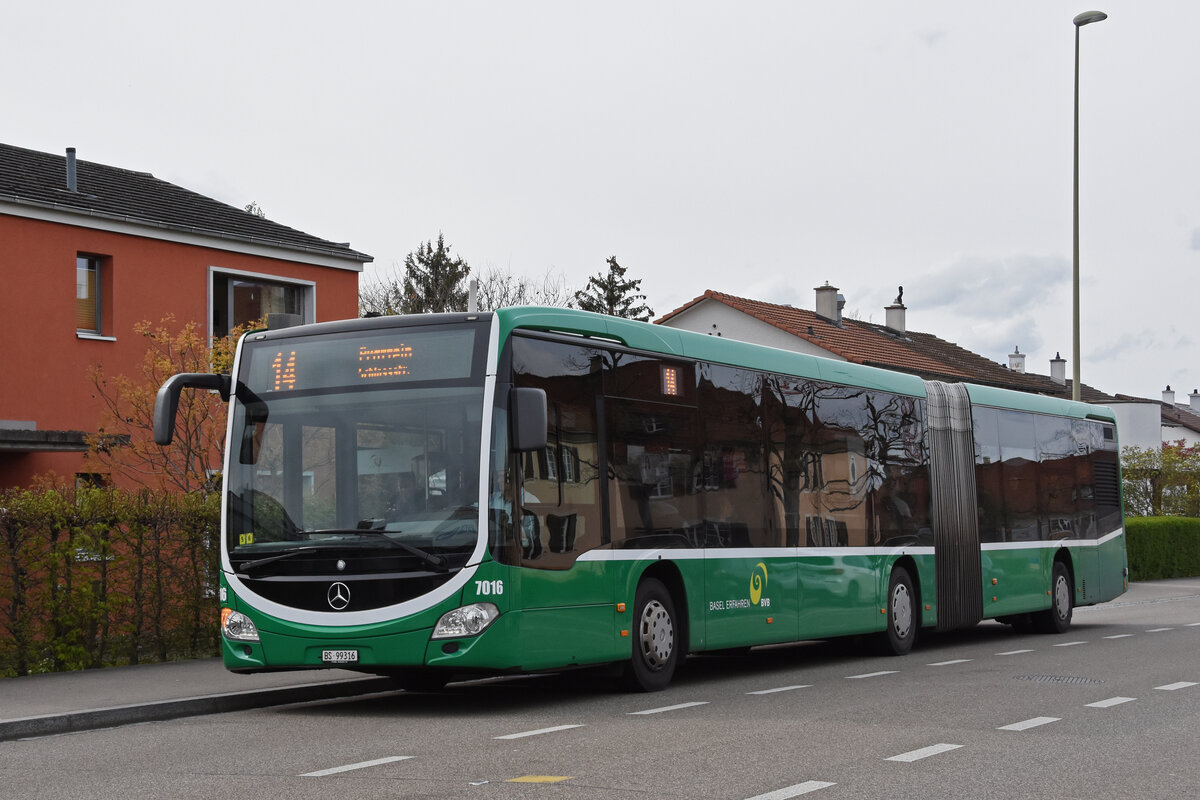 Mercedes Citaro 7016, auf der Tramersatzlinie 14, die wegen einer Grossbaustelle nicht mit Tramzügen fahren kann, bedient am 11.04.2023 die provisorische Haltestelle Freidorf.