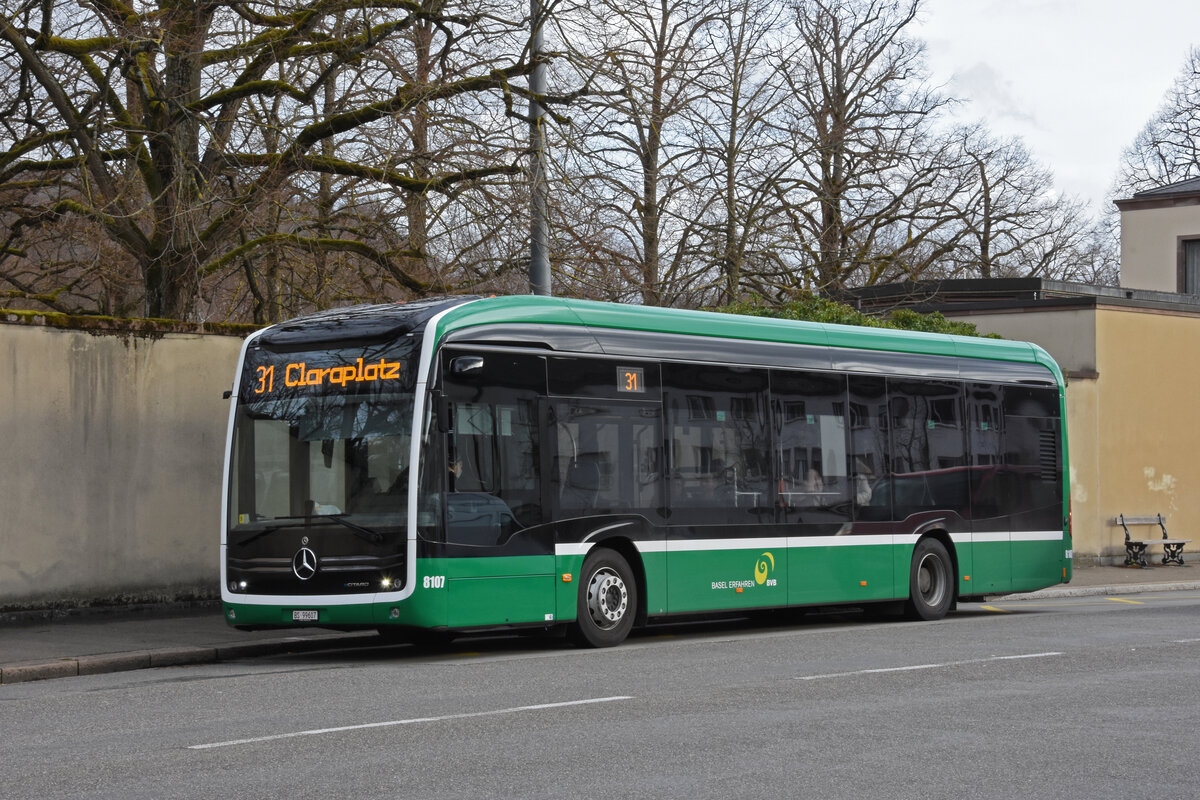 Mercedes eCitaro 8107, auf der Linie 31, bedient am 12.03.2023 die Haltestelle Friedhof am Hörnli.