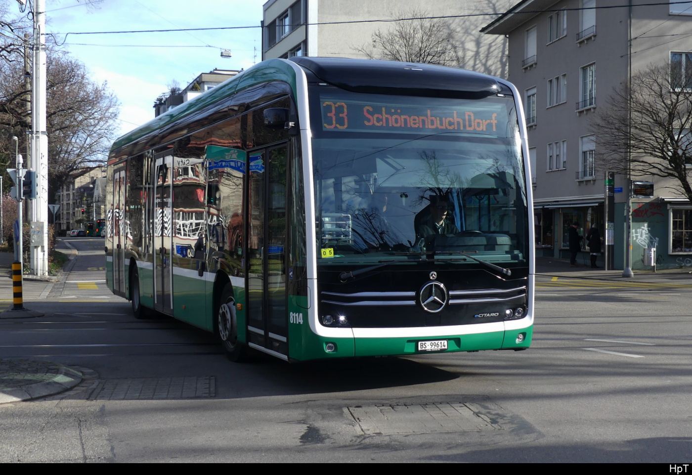 BVB - Mercedes eCitaro Nr.8114 BS 99614 unterwegs in der Stadt Basel am 04.02.2024