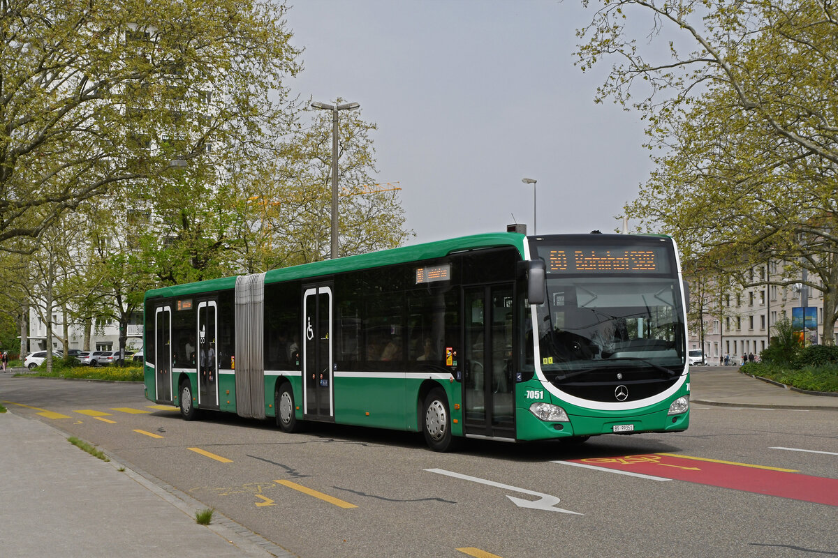 Mercedes Citaro 7051, auf der Linie 50, verlässt am 08.04.2024 die Haltestelle Kannenfeldplatz.