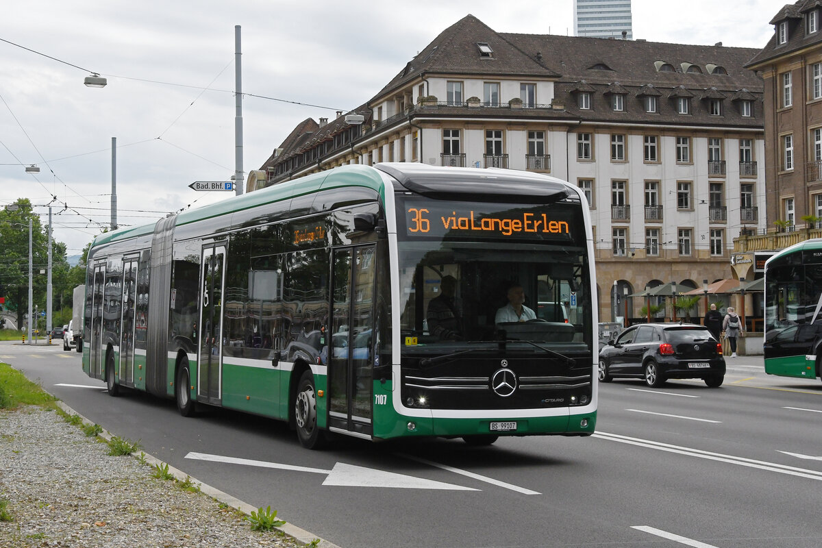 Mercedes eCitaro 7107, auf der Linie 36, verlässt am 27.05.2024 die Haltestelle am badischen Bahnhof.