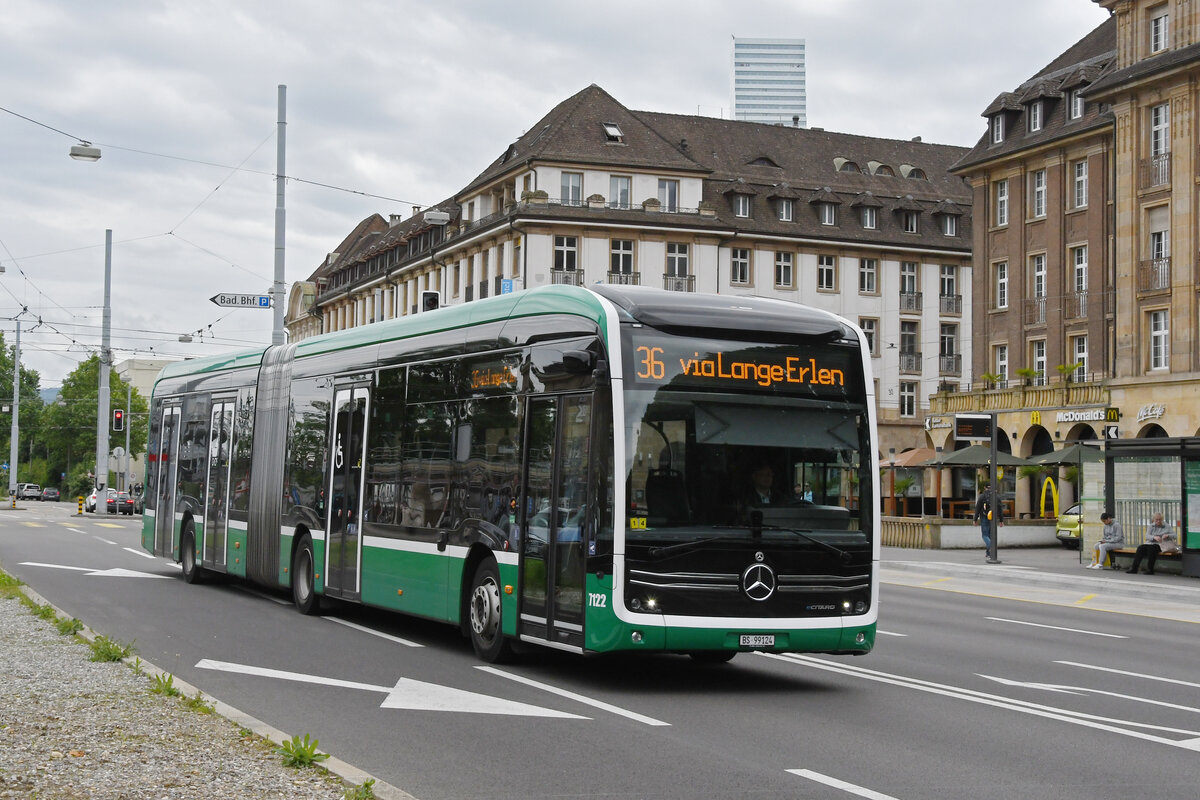 Mercedes eCitaro 7122, auf der Linie 36, verlässt am 27.05.2024 die Haltestelle beim badischen Bahnhof. Aufnahme Basel.