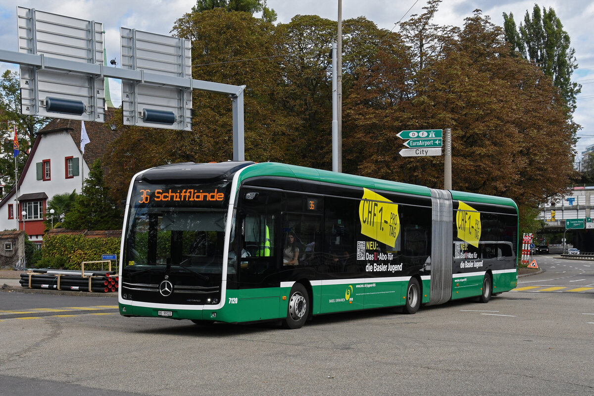 Mercedes eCitaro 7120, auf der Linie 36, fährt am 30.09.2024 bei der Haltestelle St. Jakob ein. Aufnahme Basel.