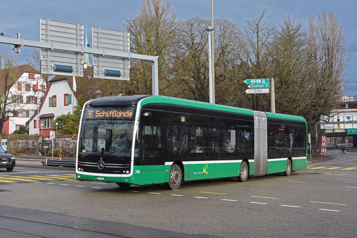 Mercedes eCitaro 7131, auf der Linie 36, fährt am 06.01.2025 zur Haltestelle St. Jakob. Aufnahme Basel.