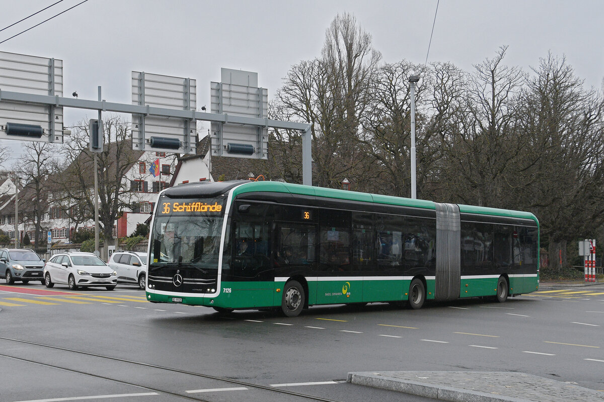 Mercedes eCitaro 7126, auf der Linie 36, fährt am 12.01.2026 zur Haltestelle St. Jakob. Aufnahme Basel.