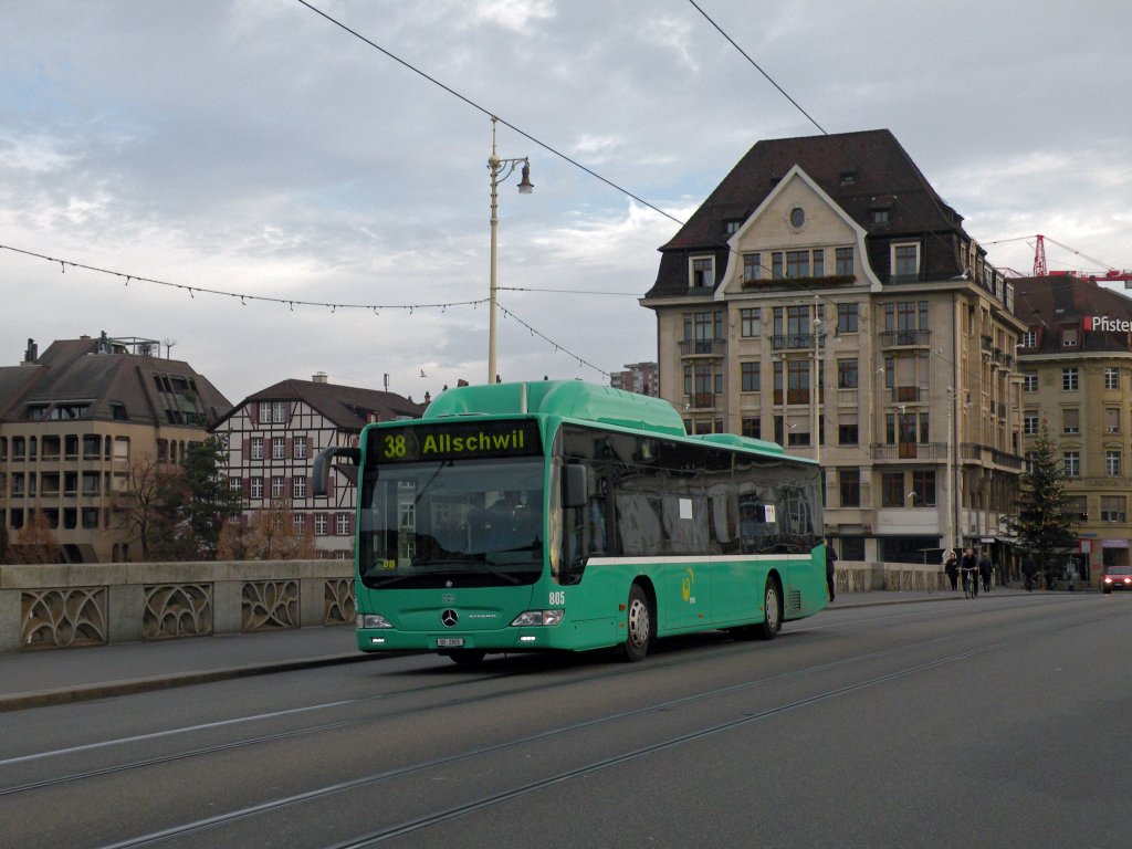 Mercedes Citaro der Basler Verkehrsbetriebe mit der Betriebsnummer 805 überquert die Mittlere Rheinbrücke Richtung Schifflände. Die Aufnahme stammt vom 21.11.2009.
