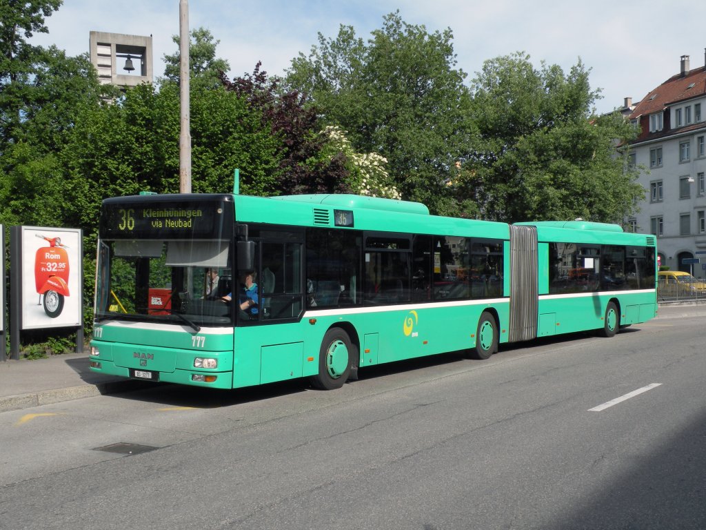 MAN Bus mit der Betriebsnummer 777 auf der Linie 36 an der Haltestelle Thomaskirche in Basel. Die Aufnahme stammt vom 09.05.2011.