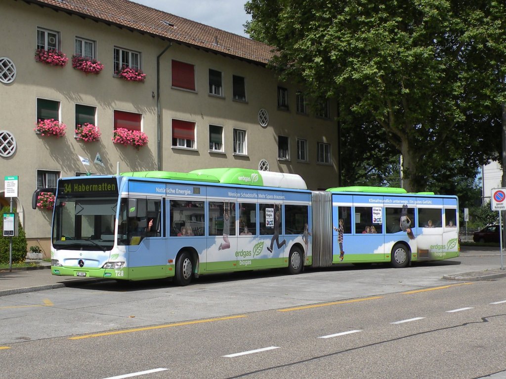 Mercedes Citaro mit der Betriebsnummer 728 auf der Linie 34 an der Haltestelle Habermatten in Riehen. Die Aufnahme stammt vom 09.07.2012.