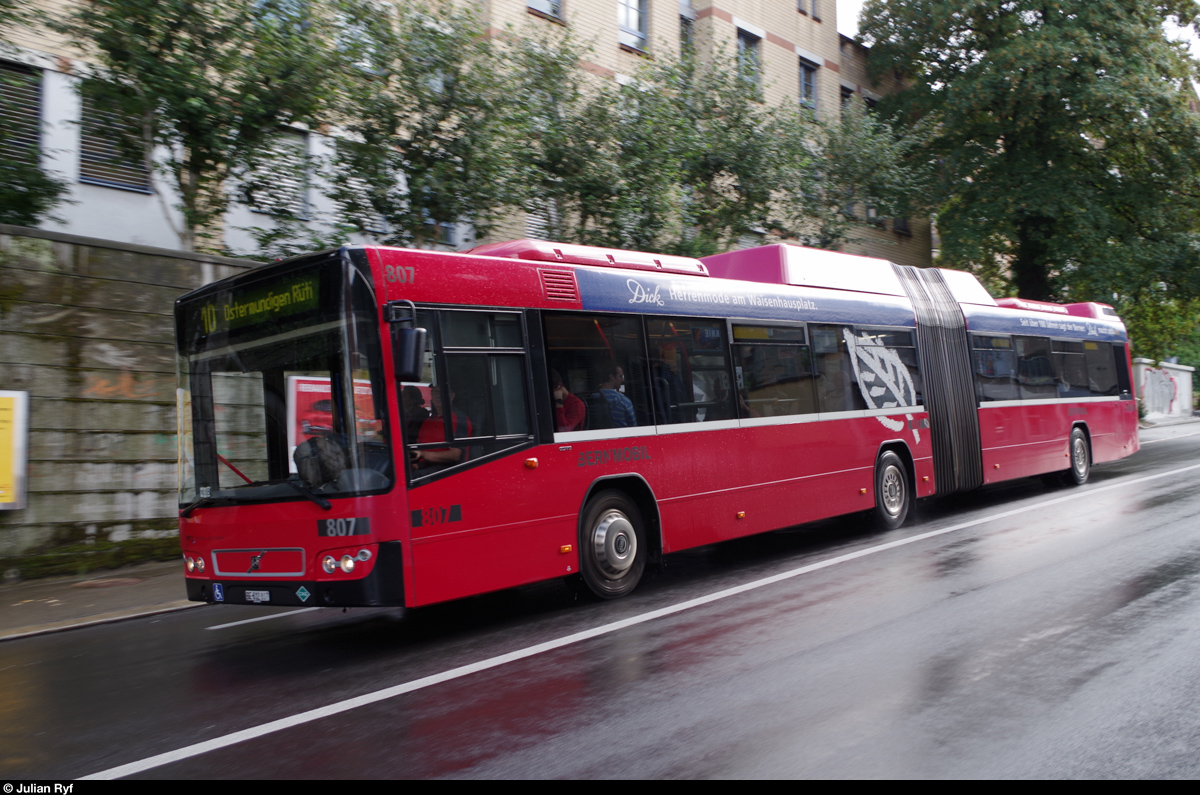 Mitzieher auf Volvo 807 von BERNMOBIL, der am 15. August 2014 die Schwarzenburgstrasse runterfährt zum Eigerplatz.
