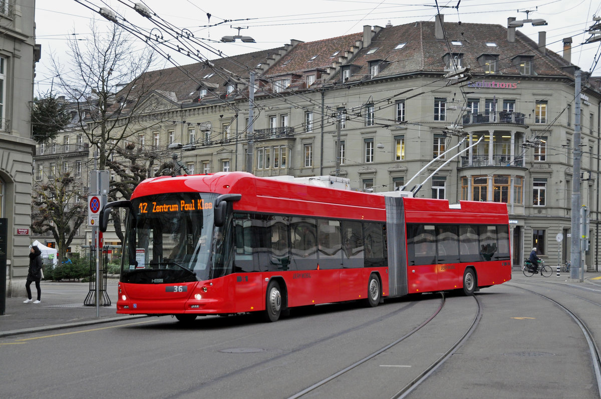 Hess Trolleybus 36, auf der Linie 12, fährt zur Haltestelle beim Bahnhof Bern. Die Aufnahme stammt vom 19.12.2018.
