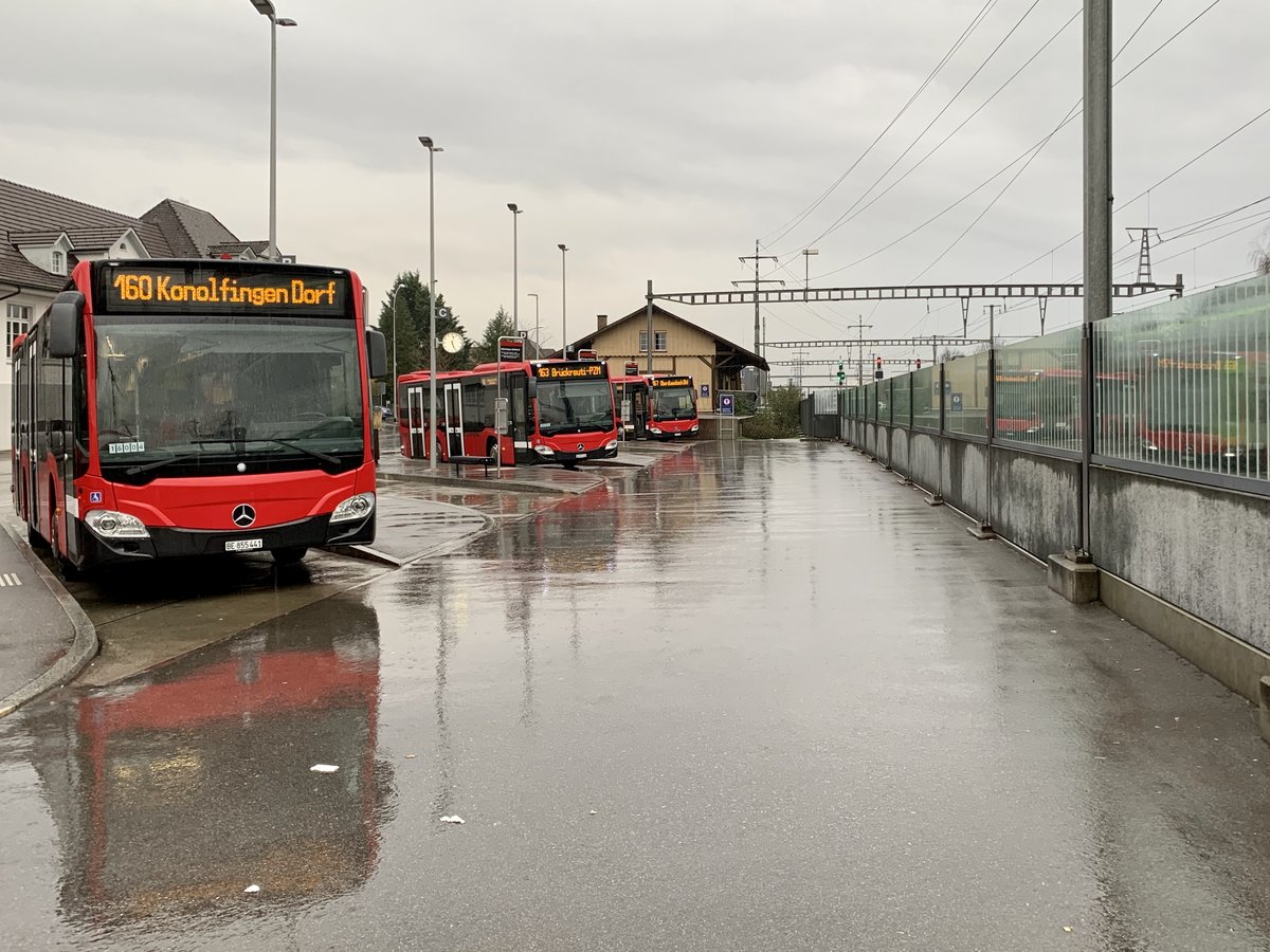 Drei MB C2 K hybrid 441. 442 und 444 von Bernmobil am 5.3.20 auf dem Bahnhofplatz Münsingen.