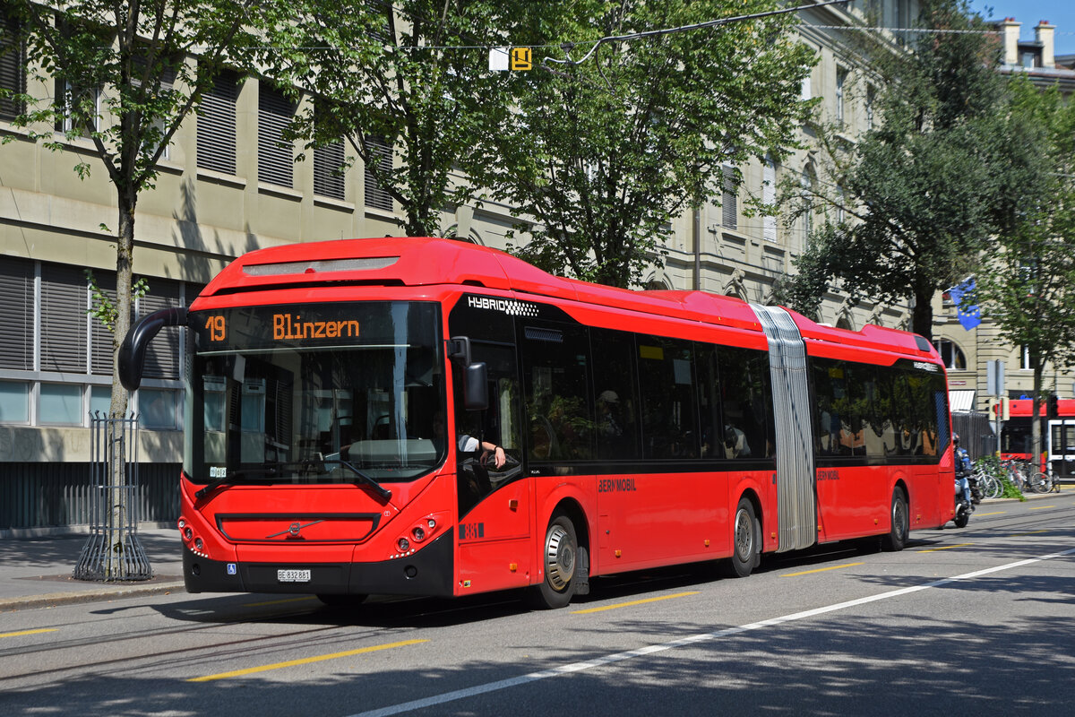 Volvo Hybridbus 881, auf der Linie 19, fährt durch die Bundesgasse. Die Aufnahme stammt vom21.08.2021.
