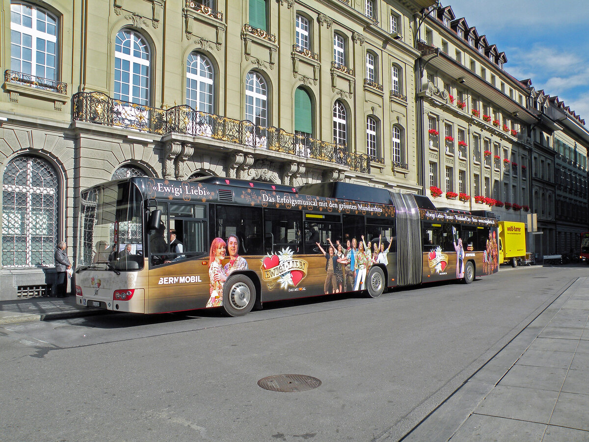 Volvo Bus 809 mit der Werbung für das Musical "Ewigi Liebi", auf der Linie 19, bedient die Haltestelle beim Bundesplatz. Die Aufnahme stammt vom 01.11.2010.