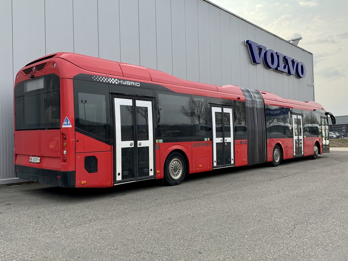 Heckansicht des Volvo 7900 Hybrid 871 von BERNMOBIL am 11.3.22 bei Volvo in Münchenbuchsee.
