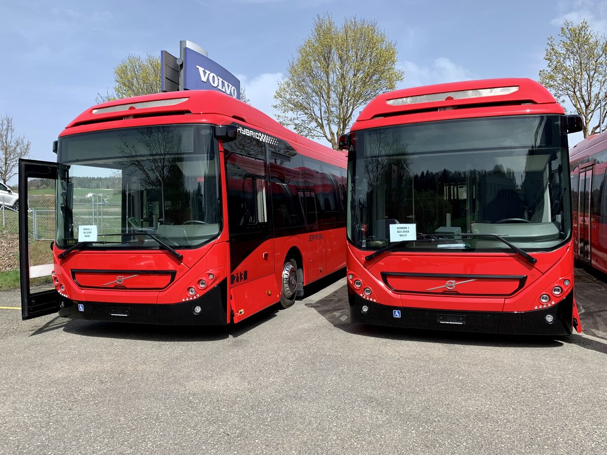 Die beiden neuen Volvo 7900 Hybrid 213 und 212 für BERNMOBIL am 13.4.22 bei Volvo Münchenbuchsee.