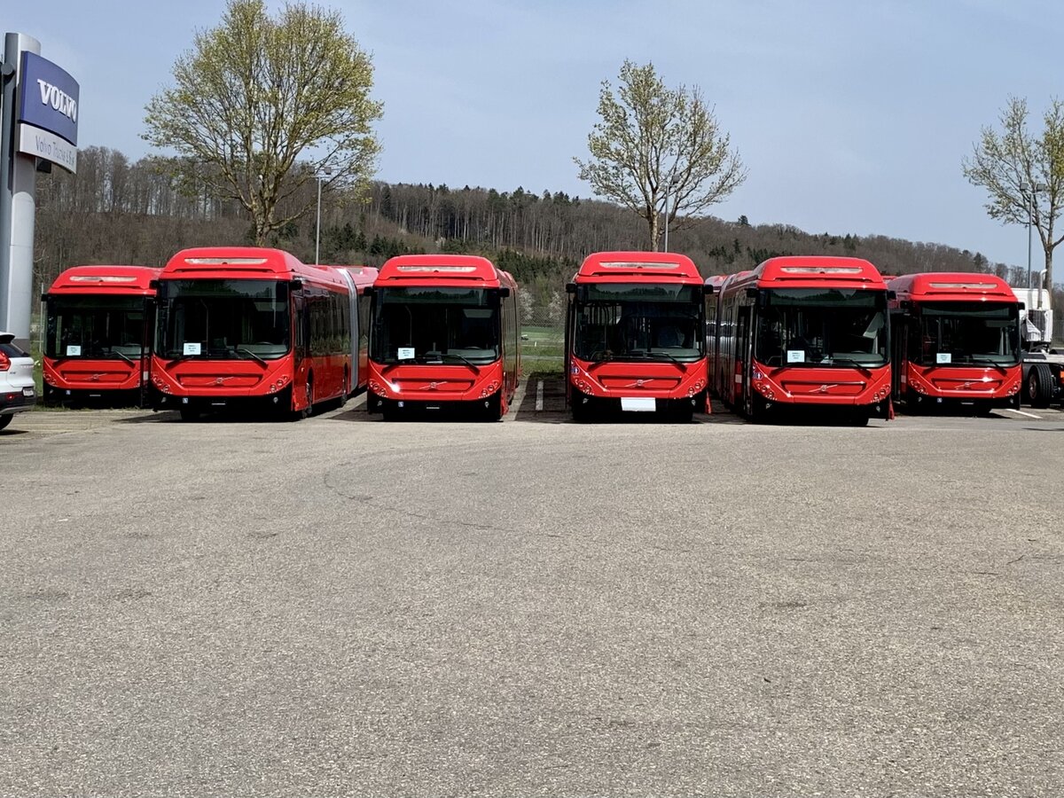 Sechs neue Solo und Gelnek Volvo 7900 Hybrid für BERNMOBIL am 13.4.22 bei Volvo in Münchenbuchsee.