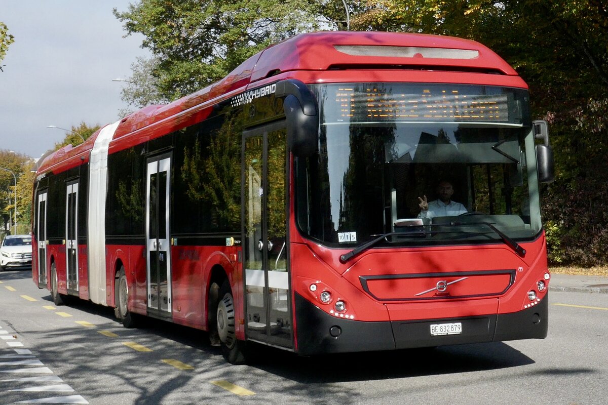 Volvo 7900 Hybrid 879 von BERNMOBIL am 19.10.22 kur vor Köniz Schliern.