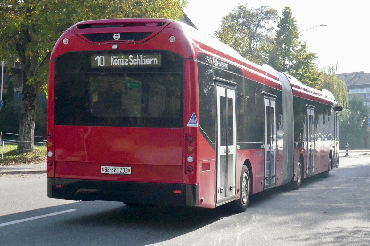 Heckansicht des Volvo 7900 Hybrid 233 am 19.10.22 kurz vor Köniz Schliern.
