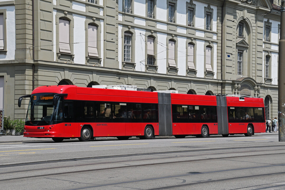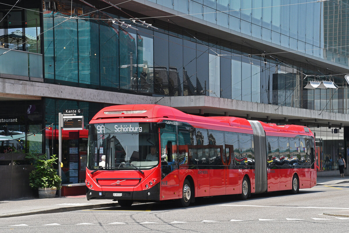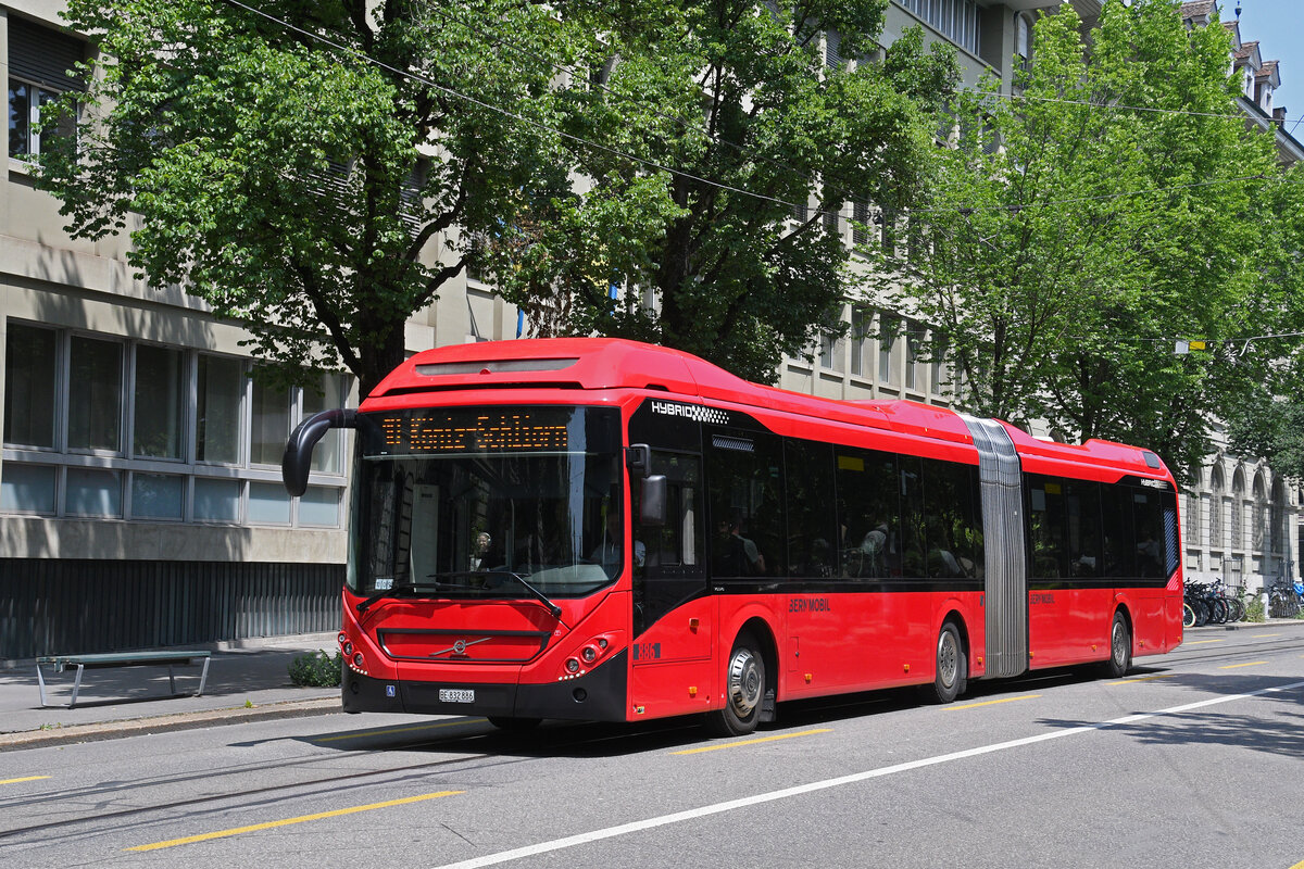 Volvo Hybridbus 232, auf der Linie 19, fährt am 11.06.2025 durch die Bundesgasse. Aufnahme Bern.