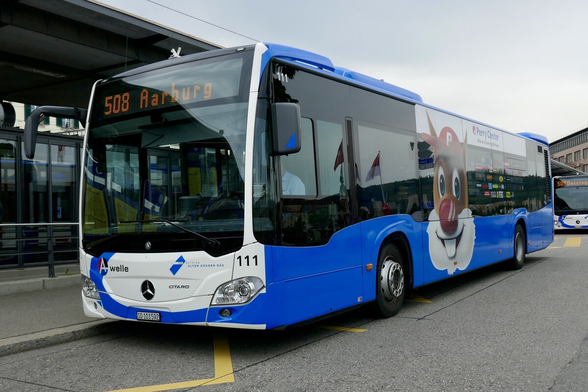 MB C2 hybrid Nr. 111 der BOGG mit Vollwerbung Perry Center am 22.5.22 beim Bahnhof Olten.