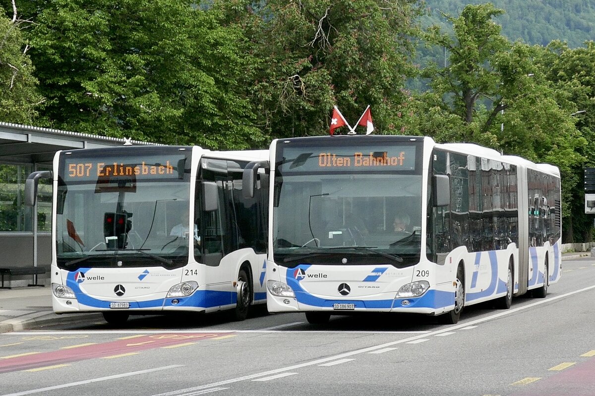 Die beiden MB C2 G Nr. 214 und 209 "Solothurn" der BOGG am 22.5.22 vor dem Bahnhof Olten.