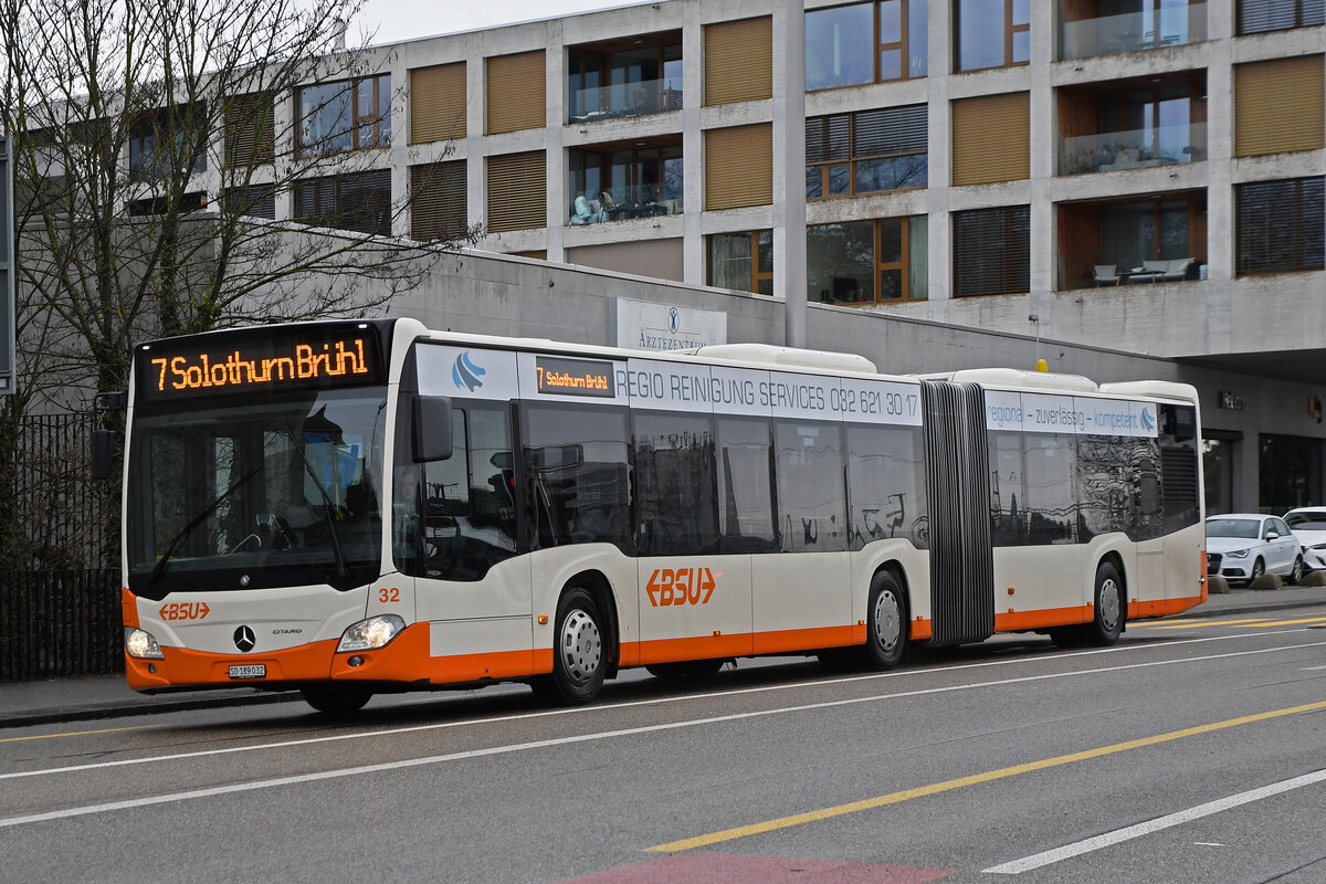 Mercedes Citaro 32, auf der Linie 7, fährt am 18.01.2023 zur Haltestelle beim Bahnhof Solothurn.