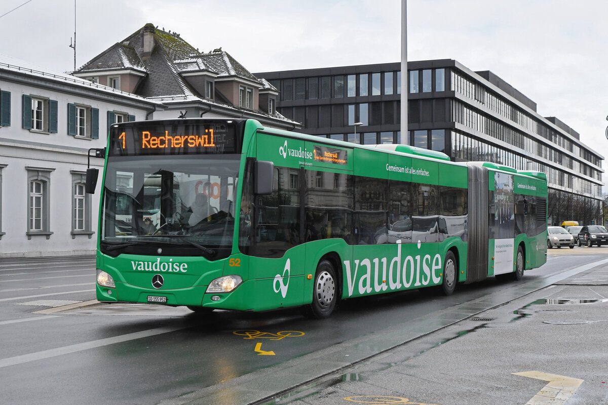 Mercedes Citaro 52 mit der Vaudoise Werbung, auf der Linie 1, fährt am 18.01.2023 zur Haltestelle beim Bahnhof Solothurn.