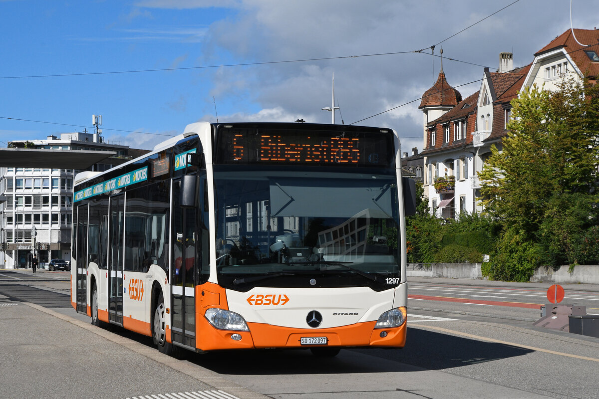 Mercedes Citaro 1297, auf der Linie 6, bedient am 15.09.2025 die Haltestelle beim Bahnhof Solothurn.