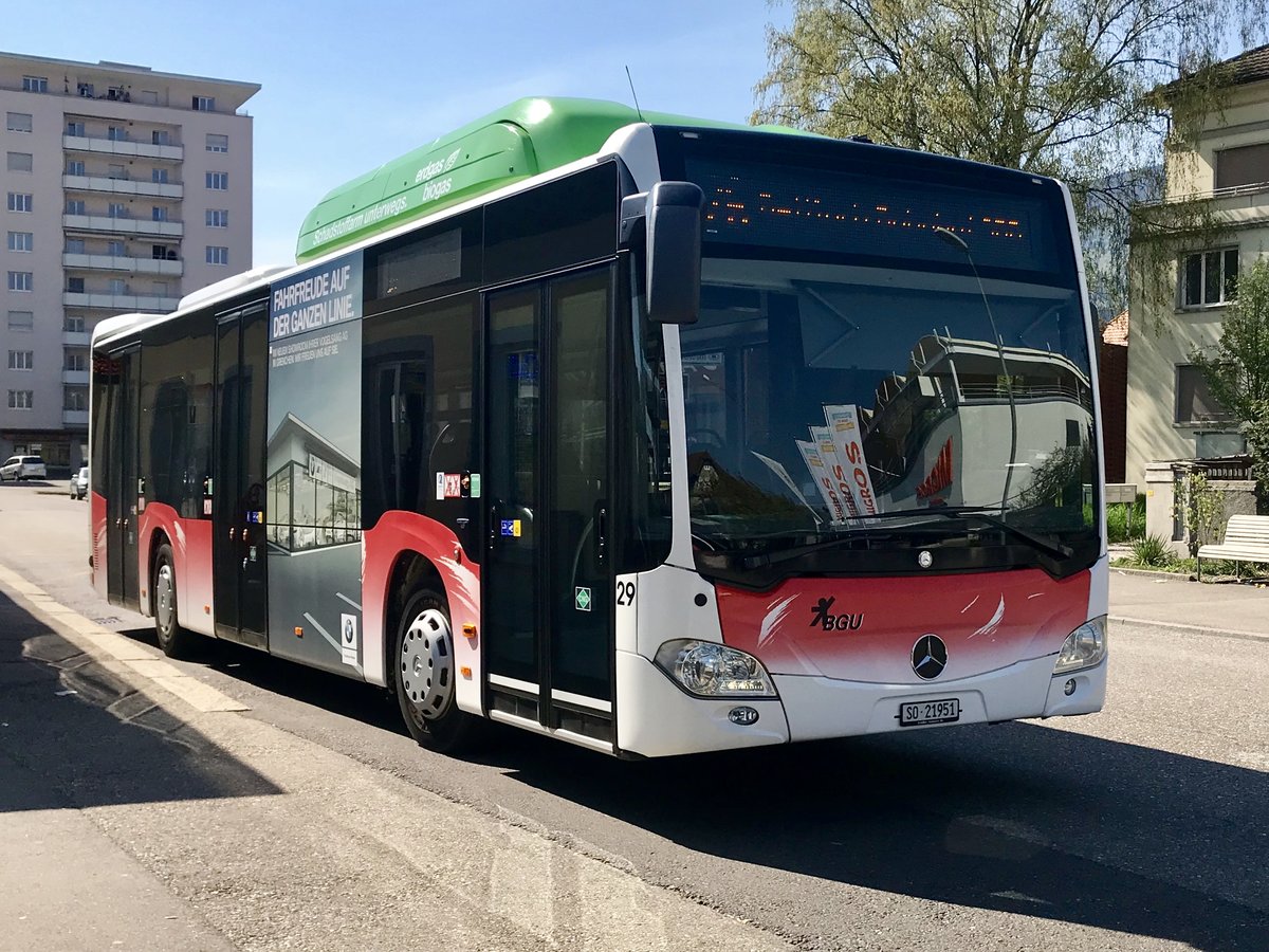 Der BGU Mercedes Citaro der 2. Generation Nr. 29 steht am 21.4.18 beim Bhf Grenchen Süd.