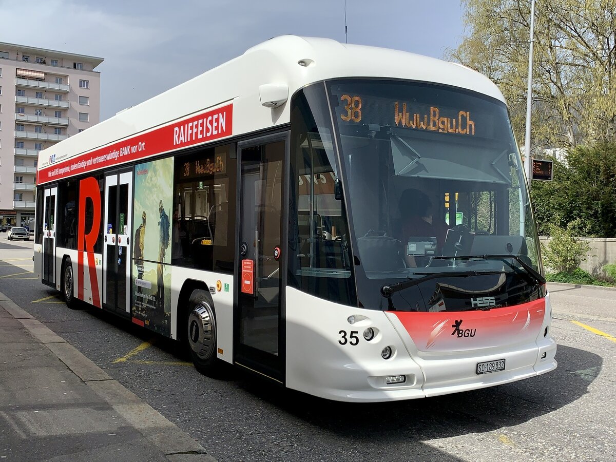 Mitten unter der Mercedes Flotte taucht dieser Elektrobus der Kantonsansässigen Carrosserie HESS auf, den die BGU für 3 Jahre auf ihrem Netz testen will, 13.4.22 beim Bahnhof Grenchen Süd.