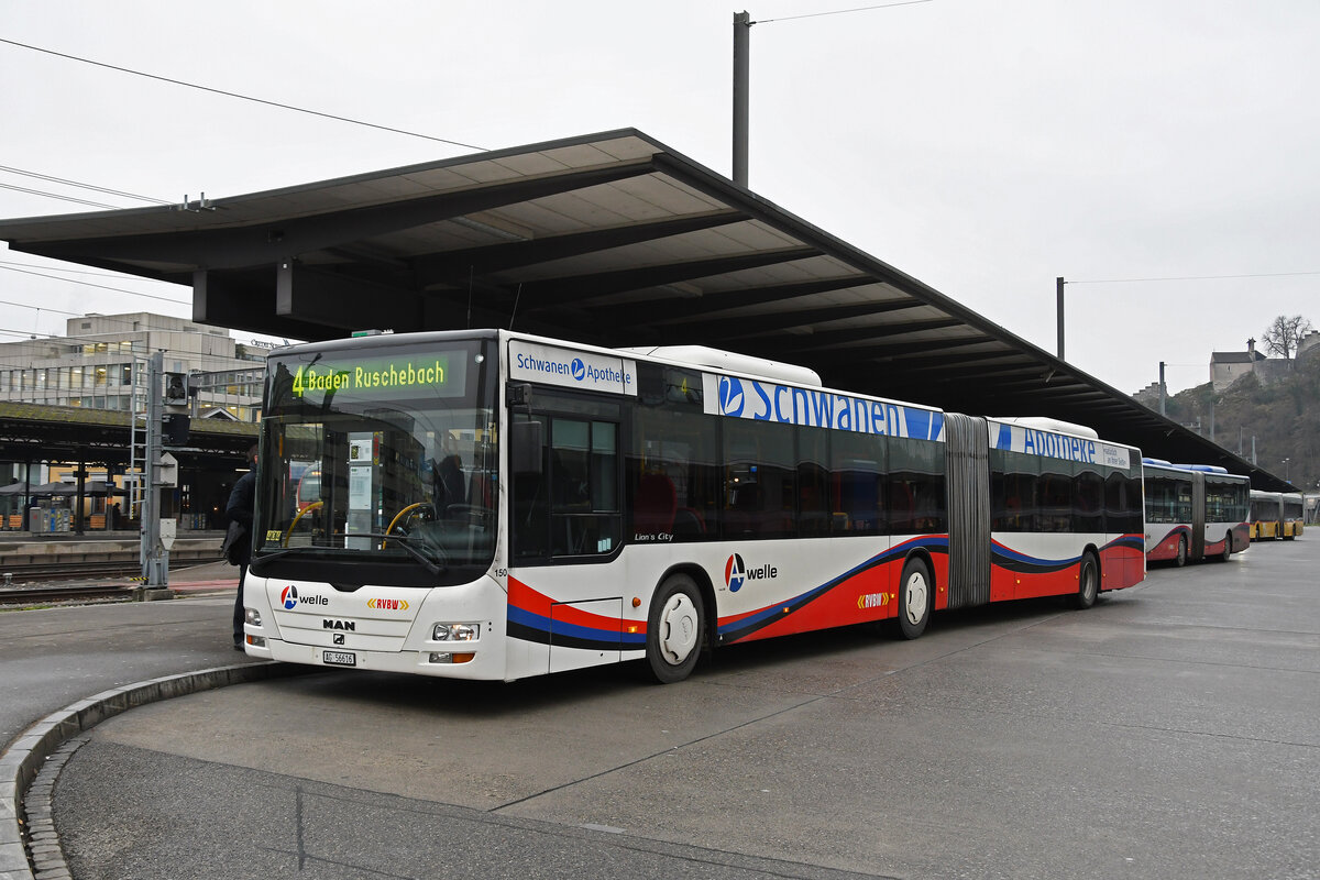MAN Lions City 150, auf der Linie 4, wartet am 25.01.2023 an der Haltestelle beim Bahnhof Baden.