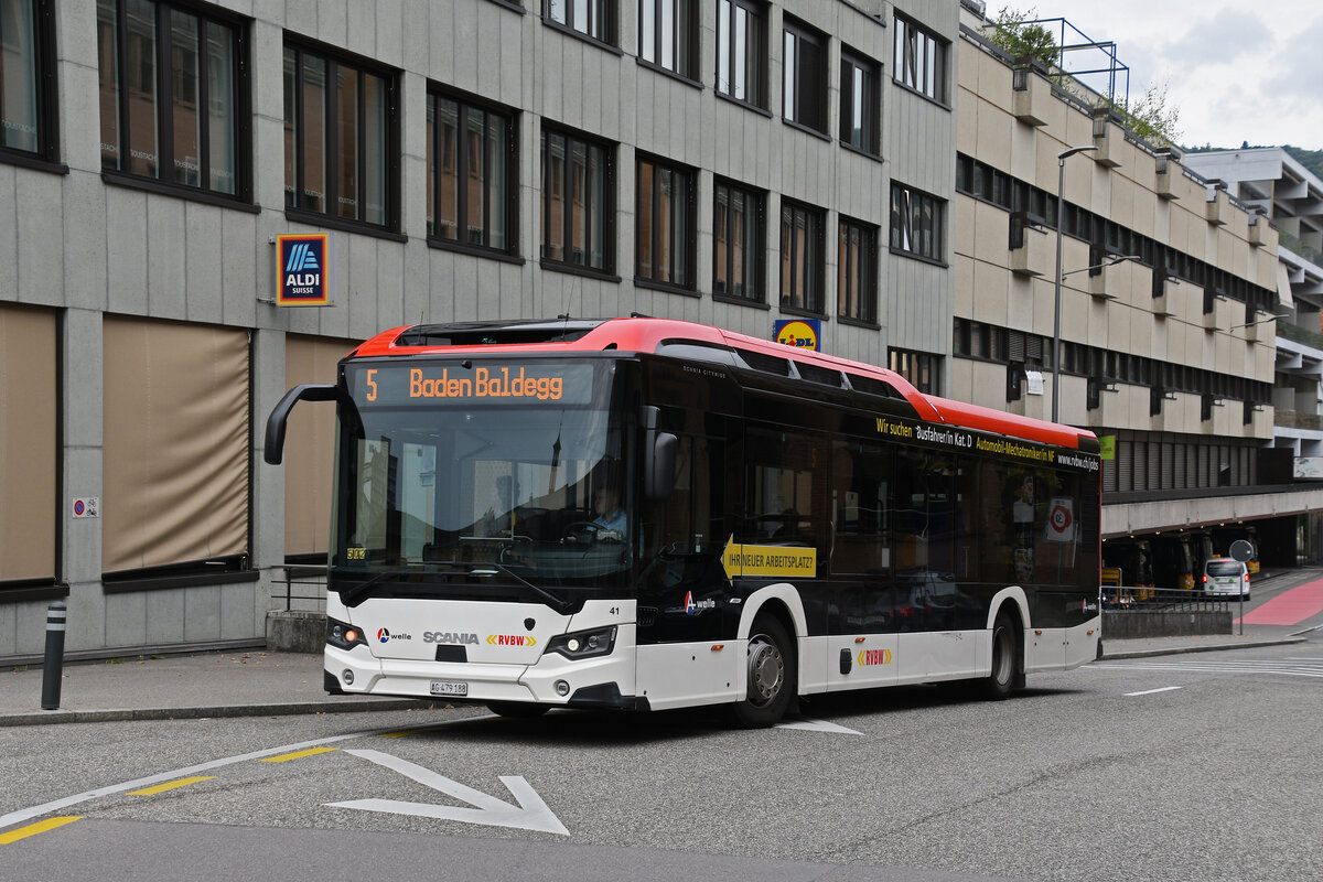 Scania Elektrobus 41, auf der Linie 5, fährt am 08.09.2025 zur Haltestelle beim Bahnhof Baden.
