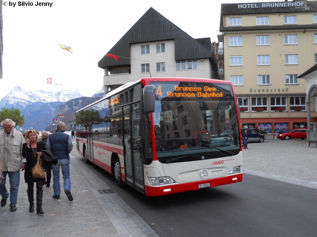AAGS Nr. 24 (Mercedes CitaroII O530Ü) am 30.10.2010 in Brunnen See, Schiffsstation. Die Fahnen oberhalb des Buses lassen es erahnen, denn an diesem Tage zog ein schwerer Föhnsturm durch das Reusstal mit Windgeschwindigkeiten von bis zu 140 km/h. Die Ausläufer davon waren auch in Brunnen noch gut zu sehen und zu fühlen.