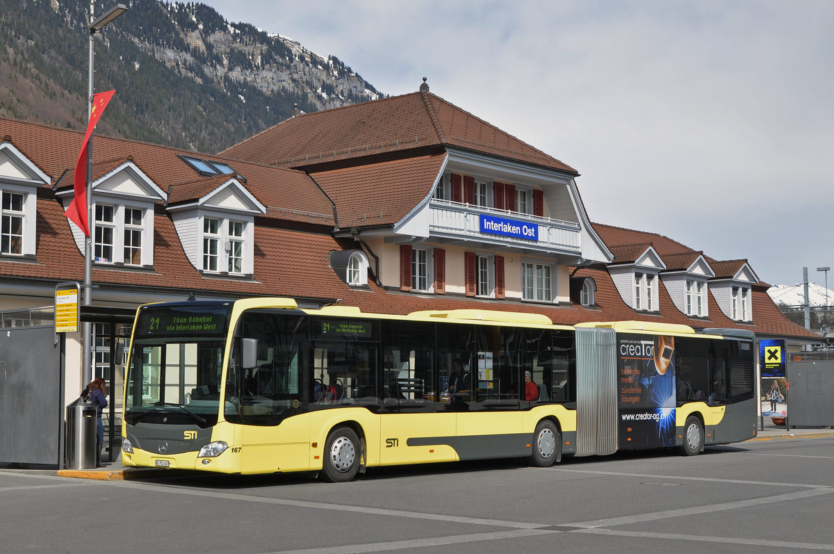 Mercedes Citaro 167, auf der Linie 21, wartet an der Endstation beim Bahnhof Interlaken Ost. Die Aufnahme stammt vom 03.04.2018.
