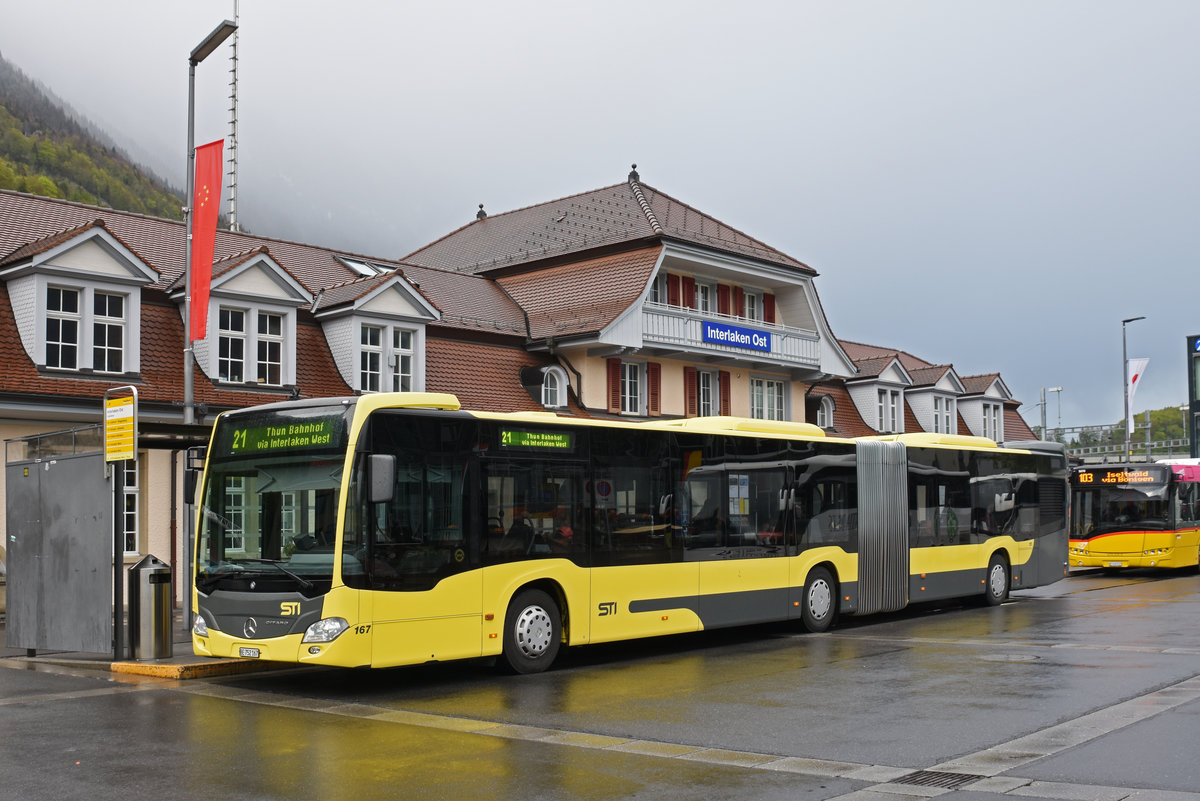 Mercedes Citaro 167, auf der Linie 21, wartet an der Endstation beim Bahnhof Interlaken Ost. Die Aufnahme stammt vom 28.04.2019.
