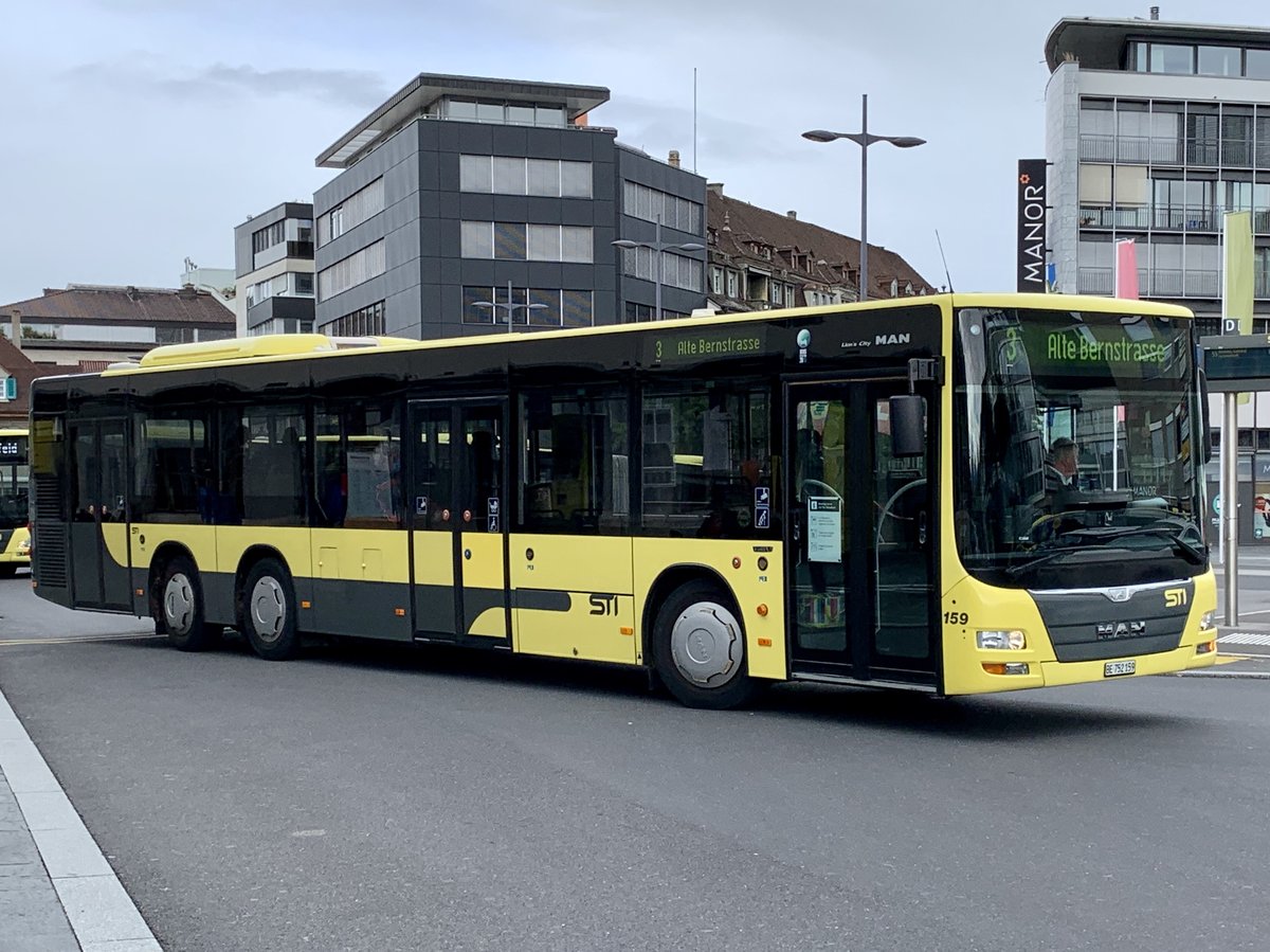 3-Achs MAN Lion's City 159 der STi am 27.9.20 bei der Abfahrt vom Bahnhofplatz Thun.