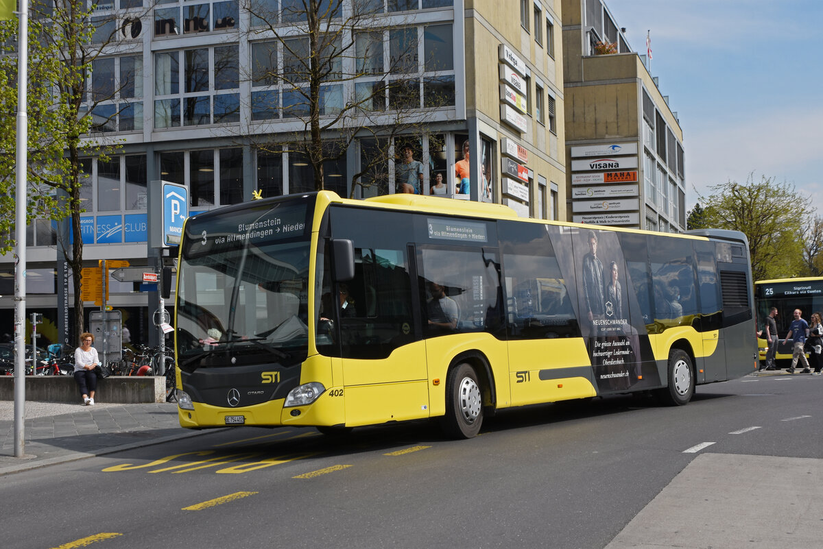 Mercedes Citaro 402, auf der Linie 3, verlässt die Haltestelle beim Bahnhof Thun. Die Aufnahme stammt vom 21.04.2022.