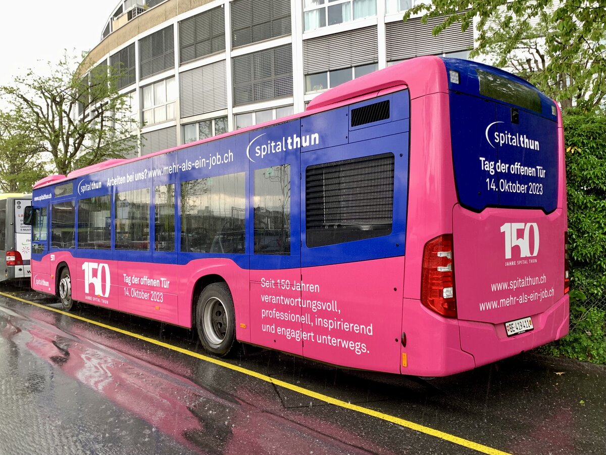 Mercedes Citaro 137 mit der Werbung für den Panorama Center, auf der Linie 21, verlässt die Haltestelle beim Bahnhof Thun. Die Aufnahme stammt vom 21.04.2022.