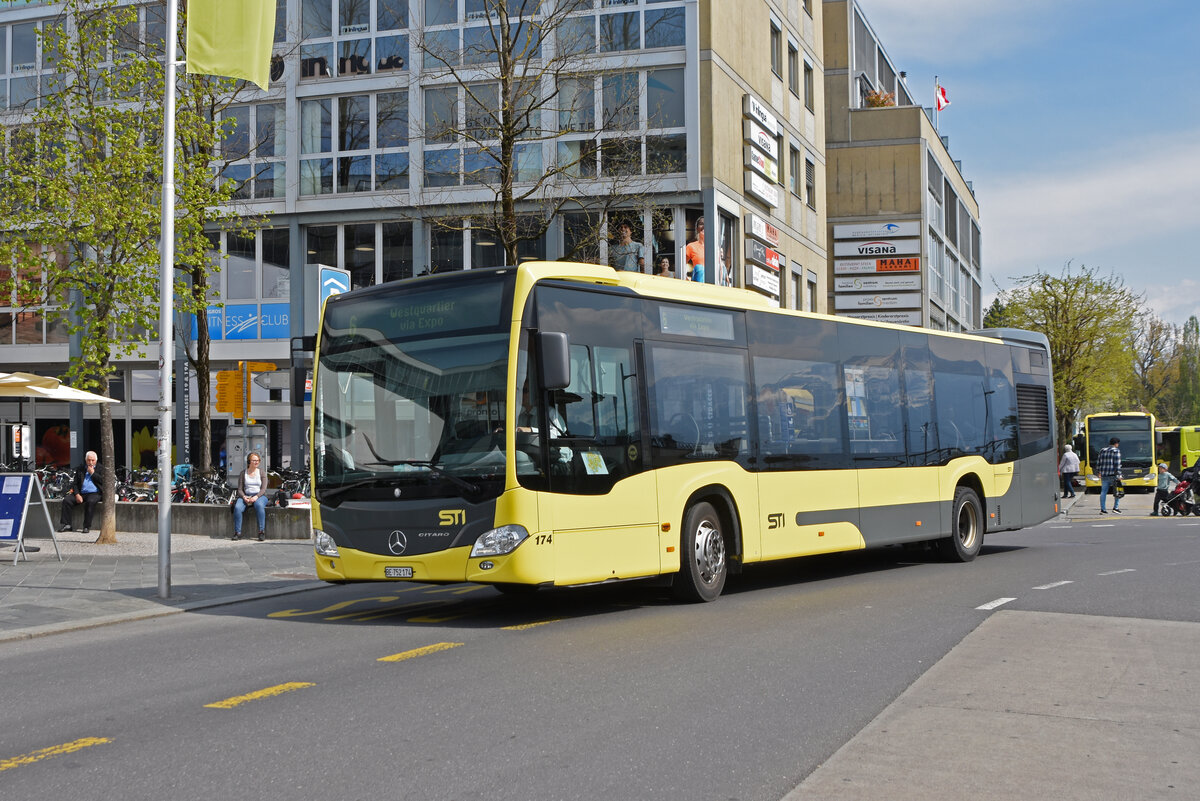 Mercedes Citaro 174, auf der Linie 6, verlässt die Haltestelle beim Bahnhof Thun.