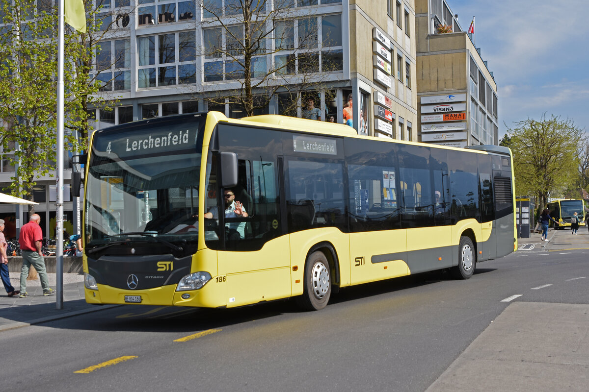 Mercedes Citaro 186, auf der Linie 4, verlässt die Haltestelle beim Bahnhof Thun. Die Aufnahme stammt vom 21.04.2022.