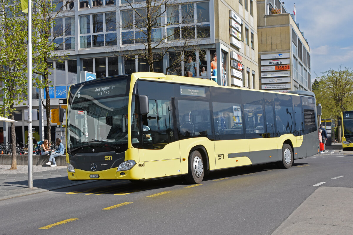 Mercedes Citaro 408, auf der Linie 6, verlässt die Haltestelle beim Bahnhof Thun.