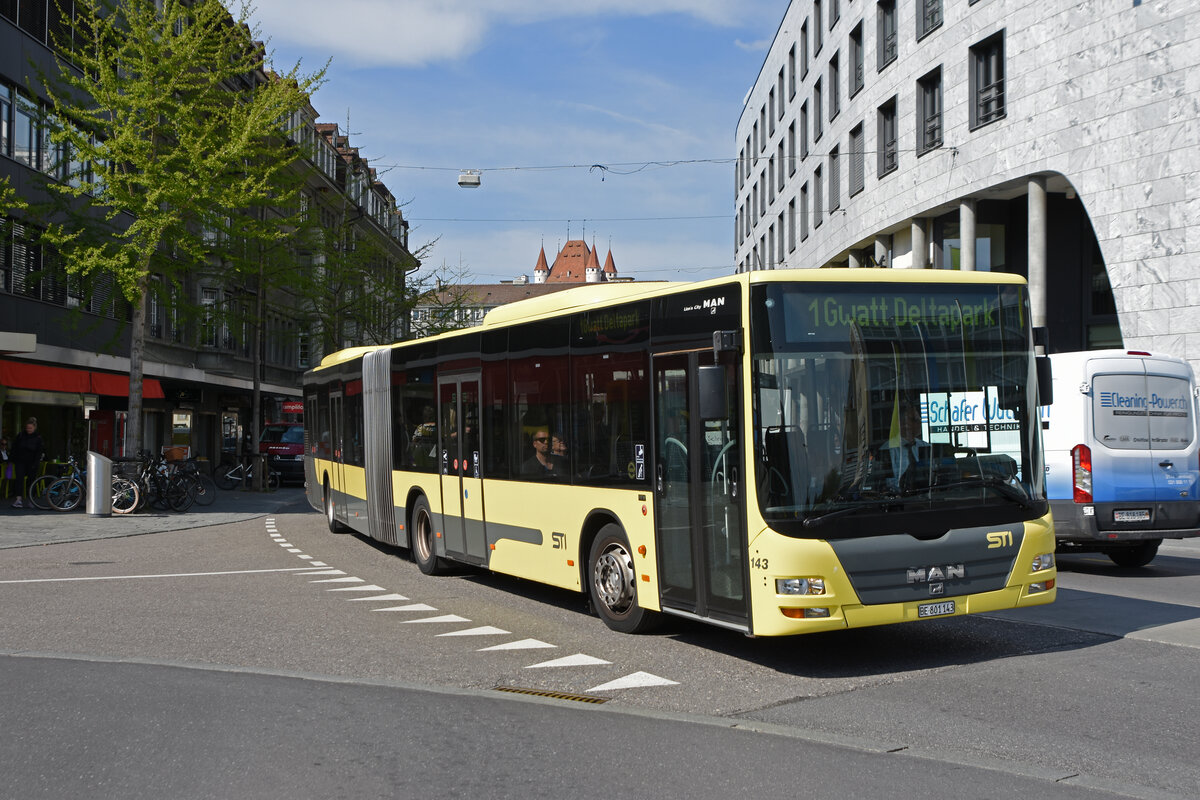 MAN Lions City 143, auf der Linie 1, fährt zur Haltestelle beim Bahnhof Thun. Die Aufnahme stammt vom 21.04.2022.