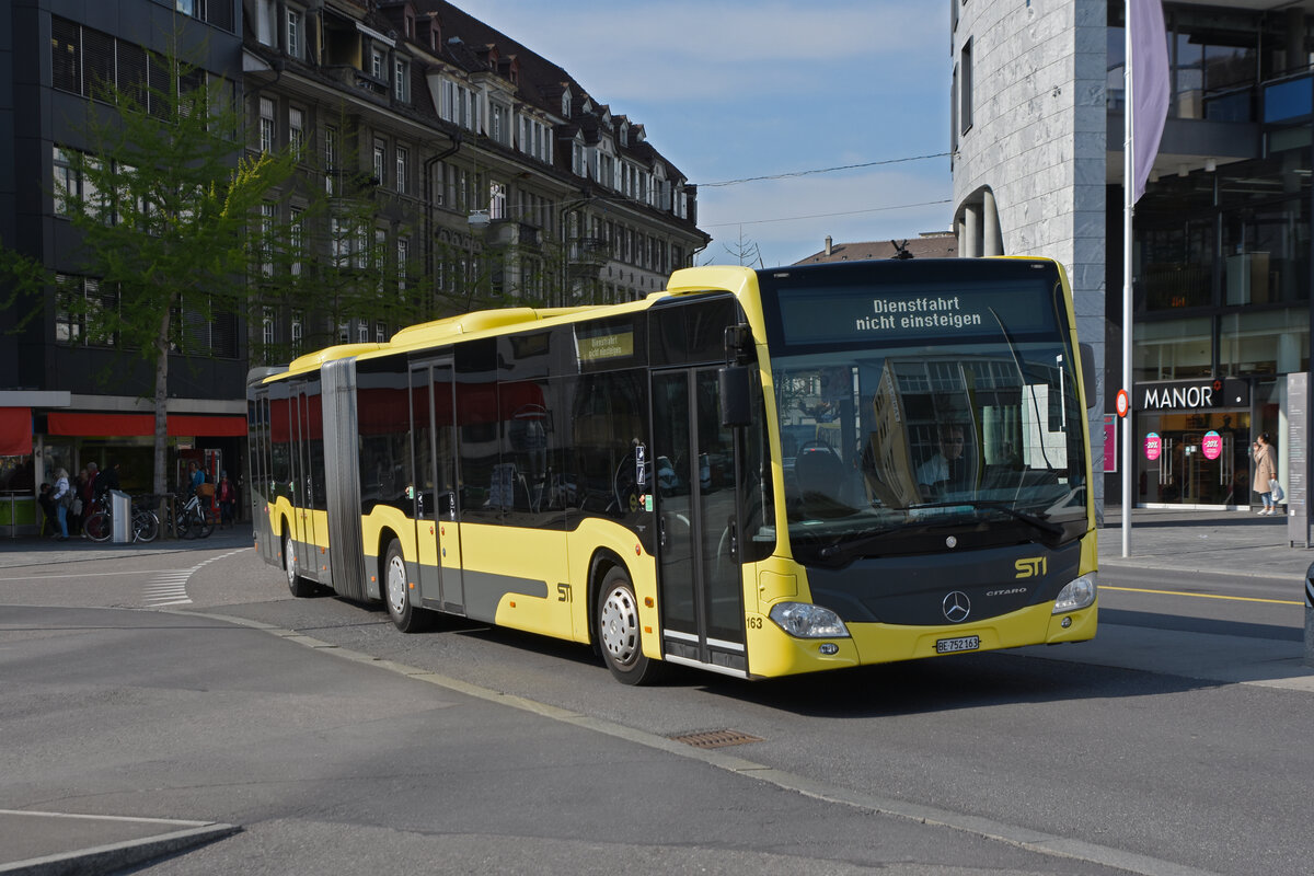 Mercedes Citaro 163, fährt am 21.04.2022 als Dienstfahrt zur Haltestelle beim Bahnhof Thun.