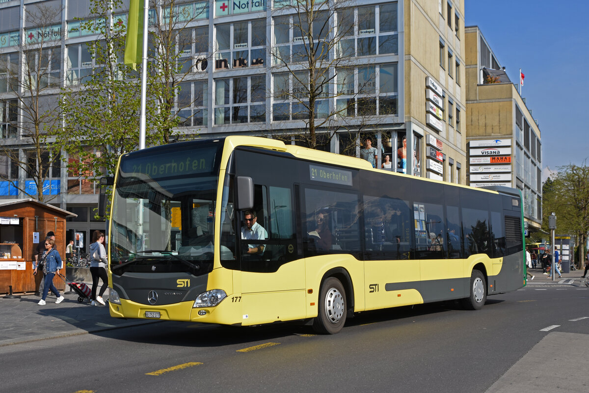 Mercedes Citaro 177, auf der Linie 21, verlässt am 21.04.2022 die Haltestelle beim Bahnhof Thun.