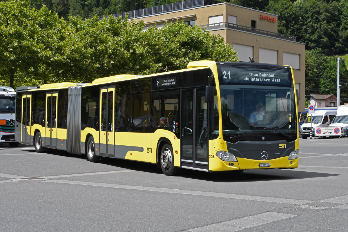 Mercedes Citaro 706 der STI, auf der Linie 21, fährt am 03.08.2023 zur Endstation beim Bahnhof Interlaken Ost.