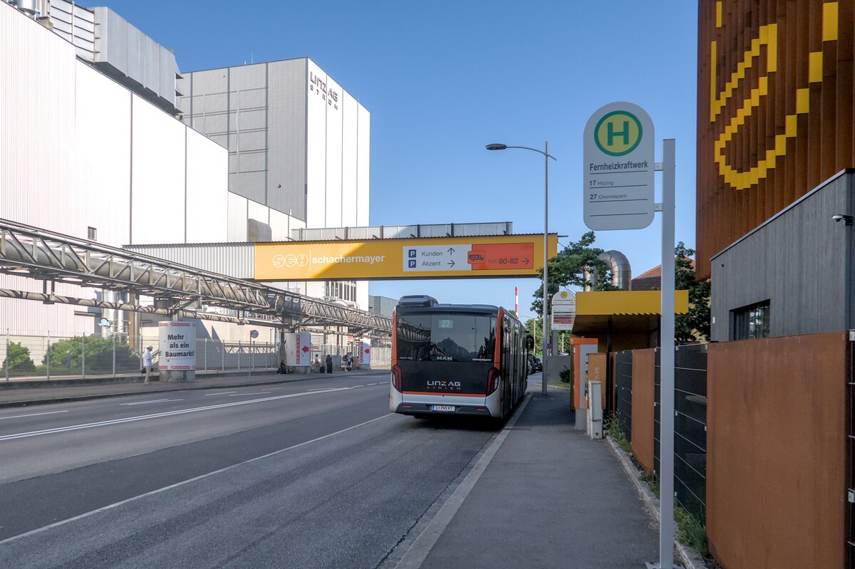MAN New Lions City EfficientHybdrid der Linz AG Linien (L-745VT) als Linie 27 an der Hst. Fernheizkraftwerk in Linz. Aufgenommen 20.6.2025.