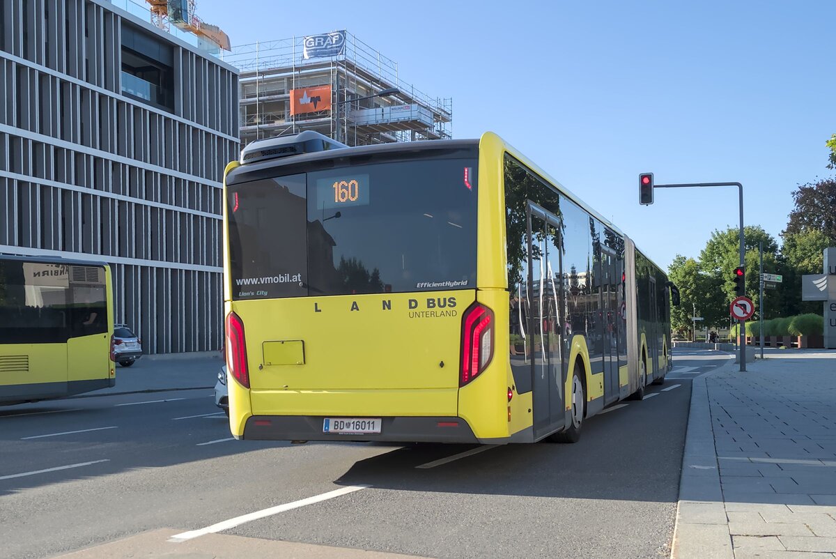 MAN New Lions City EfficientHybrid von Postbus (BD-16011) als Linie 160 an der Hst. Dornbirn Rathaus. Aufgenommen 17.7.2025.