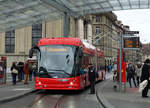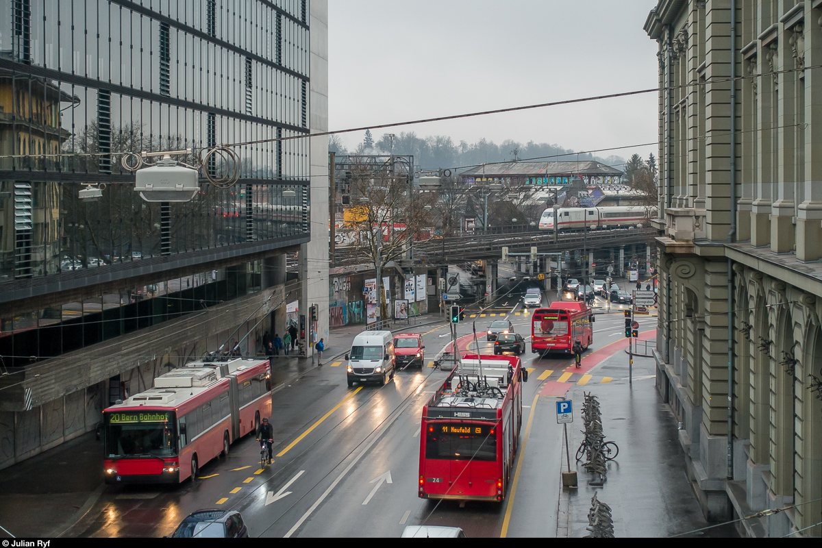 Begegnung der alten und neuen BERNMOBIL Trolleybusse 4 und 24 am 22. Dezember 2017 beim Bollwerk. Im Hintergrund auf dem Lorraineviadukt der Richtung Hamburg-Altona ausfahrende ICE 376.
