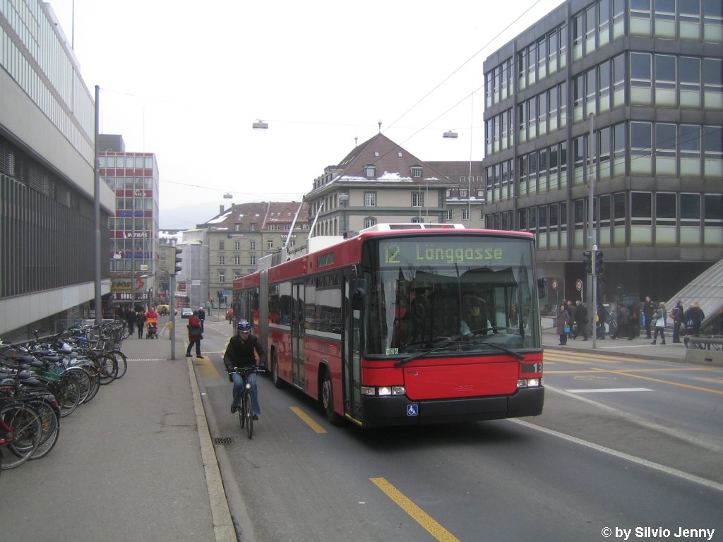 Bernmobil Nr. 13 (NAW/Hess Swisstrolley2 BGT-N) am 9.2.2010 in Bern, Schanzenstrasse. Während ein Autobus mit viel Lärm auf sich aufmerksam macht, dass er bei der Schanzenastrasse abfährt, bleibt der St2 ganz ruhig...